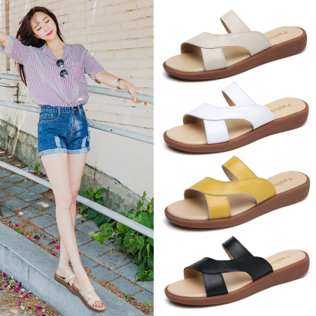 足娇212,夏季新款百搭真皮平底休闲女凉鞋拖鞋