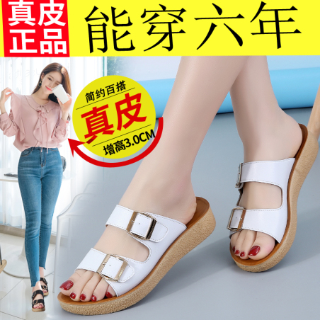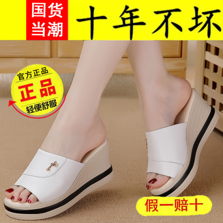 足娇W70,百搭休闲真皮坡跟增高女拖鞋