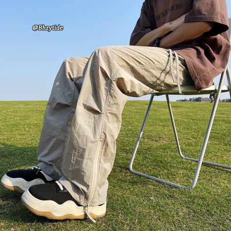 大码裤子裤脚拉链宽松阔腿直筒休闲长裤伞兵裤