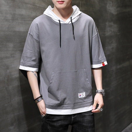 带帽港风休闲复古短袖圆领T恤宽松ins上衣男士时尚