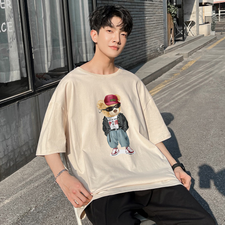 夏季短袖纯棉圆领宽松落肩圆领T恤男情侣港风小熊印花体恤打底衫