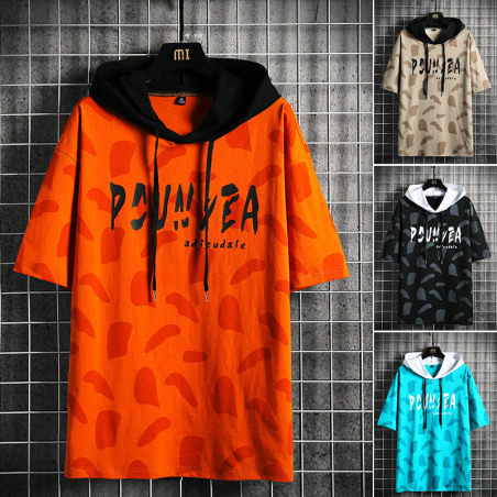 100%棉短袖t恤男夏季潮流宽松服潮牌港风学生五分袖连帽短T
