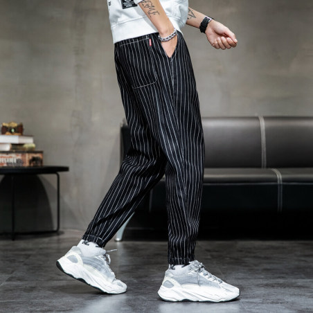 条纹牛仔时尚潮流运动风束脚裤男松紧港风元素街头标配