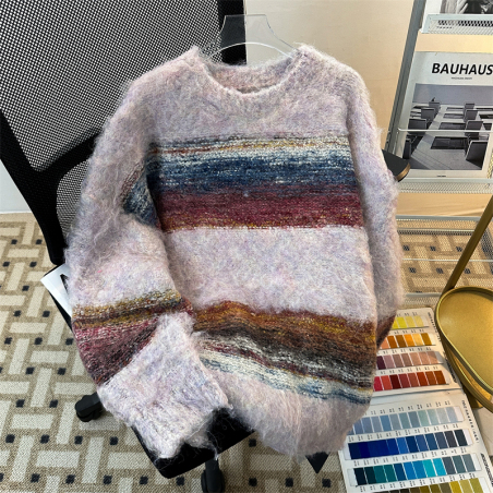 美式潮牌复古渐变条纹毛衣男女秋冬季慵懒软糯宽松百搭圆领针织衫