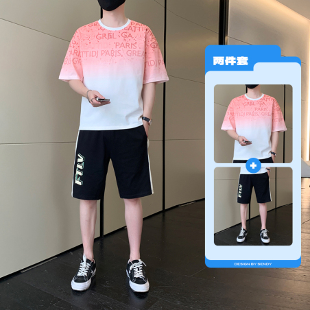 2024新款夏季男潮流宽松服潮牌渐变色短袖T恤两件套上衣圆领运动服套装