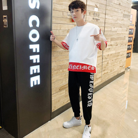 2019新款韩版休闲潮流帅气男士套装个性印花潮流青少年套装