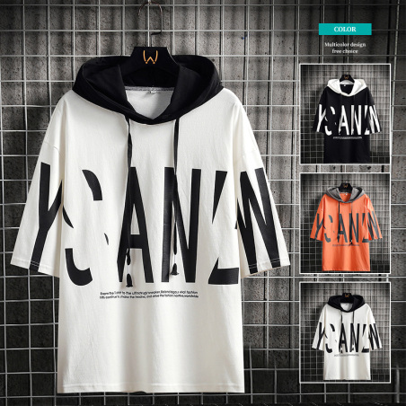 新款夏季连帽卫衣短袖T恤休闲港风文艺五分袖宽松韩版半袖