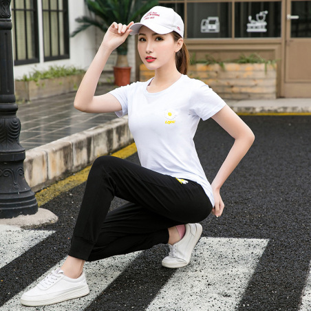 夏季女士纯棉短袖圆领小皱菊印花两件套女生束口长裤套装