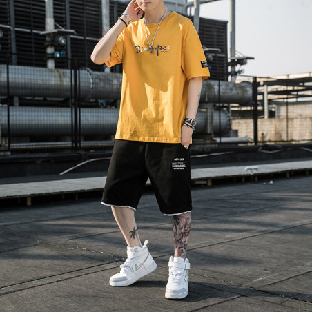 100%棉短袖t恤男夏季潮流宽松服潮牌港风学生纯棉短裤套装