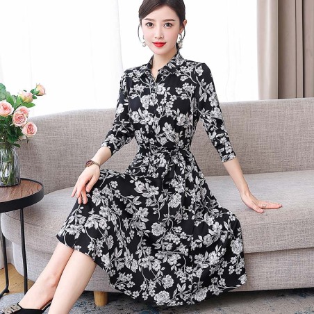 雪纺衬衫连衣裙女长袖春秋季新款韩版百搭印花显瘦大码衬