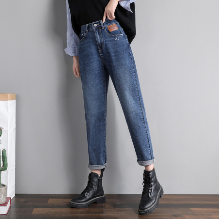 2021秋季高腰哈伦裤修身个性口袋破洞老爹百搭韩版牛仔裤女