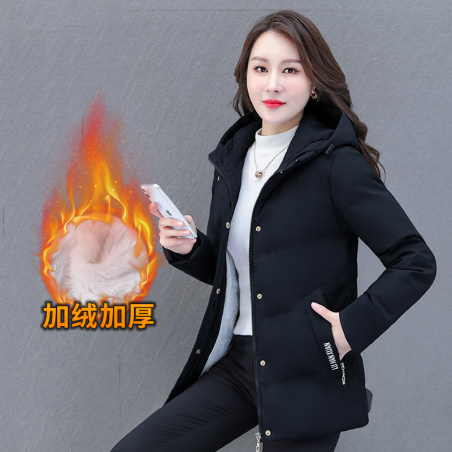 中长款棉服女韩版时尚连帽加厚保暖棉衣休闲百搭黑色棉袄外套冬装