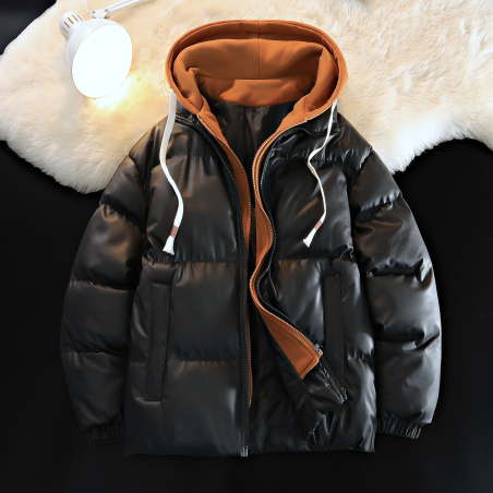 假两件羽绒棉服男冬季港风宽松PU皮百搭连帽棉袄高街潮牌棉衣外套