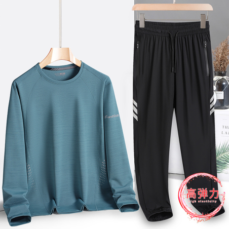 秋季新款速干冰丝长袖两件套男休闲运动弹力纯棉健身户外套装男