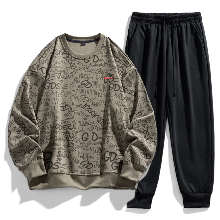 见者发财系列春秋季新款卫衣男套头圆领套装两件套时尚百搭休闲满印打底长袖T恤