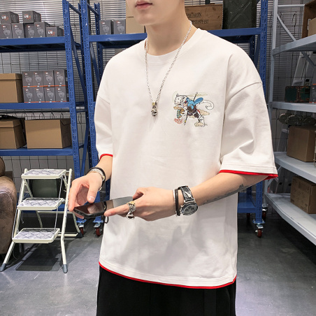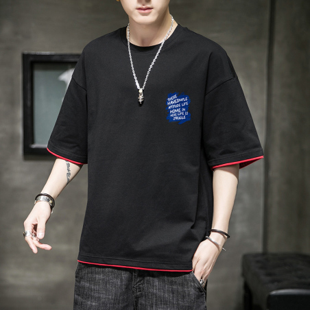 纯棉t恤短袖男潮牌假两件纯棉短袖宽松港风半袖加大码M-6XL
