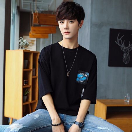 短袖t恤男圆领宽松5分袖bf原宿港风中袖男士夏装短T潮流五分