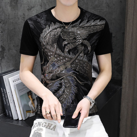 2022年欧洲站潮牌男装烫钻印花龙T恤衫微弹力流行时尚短袖