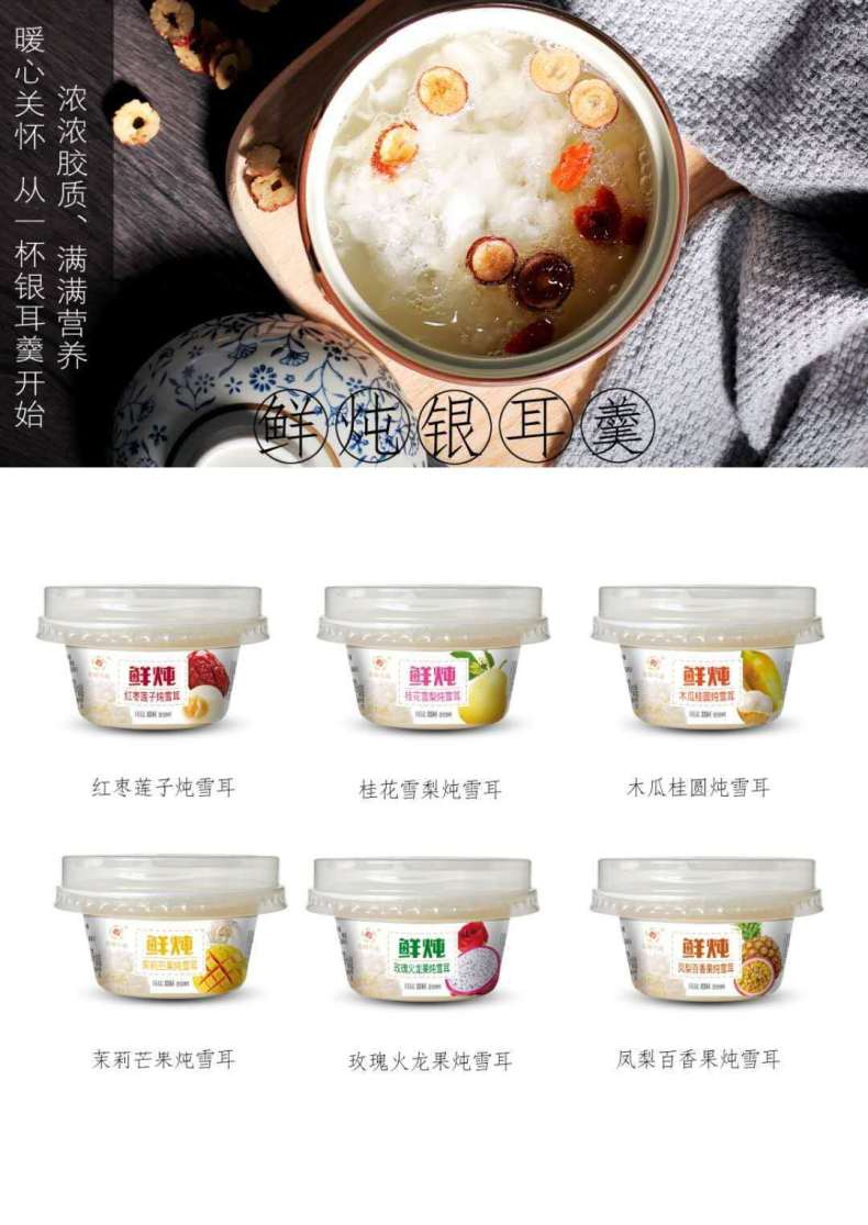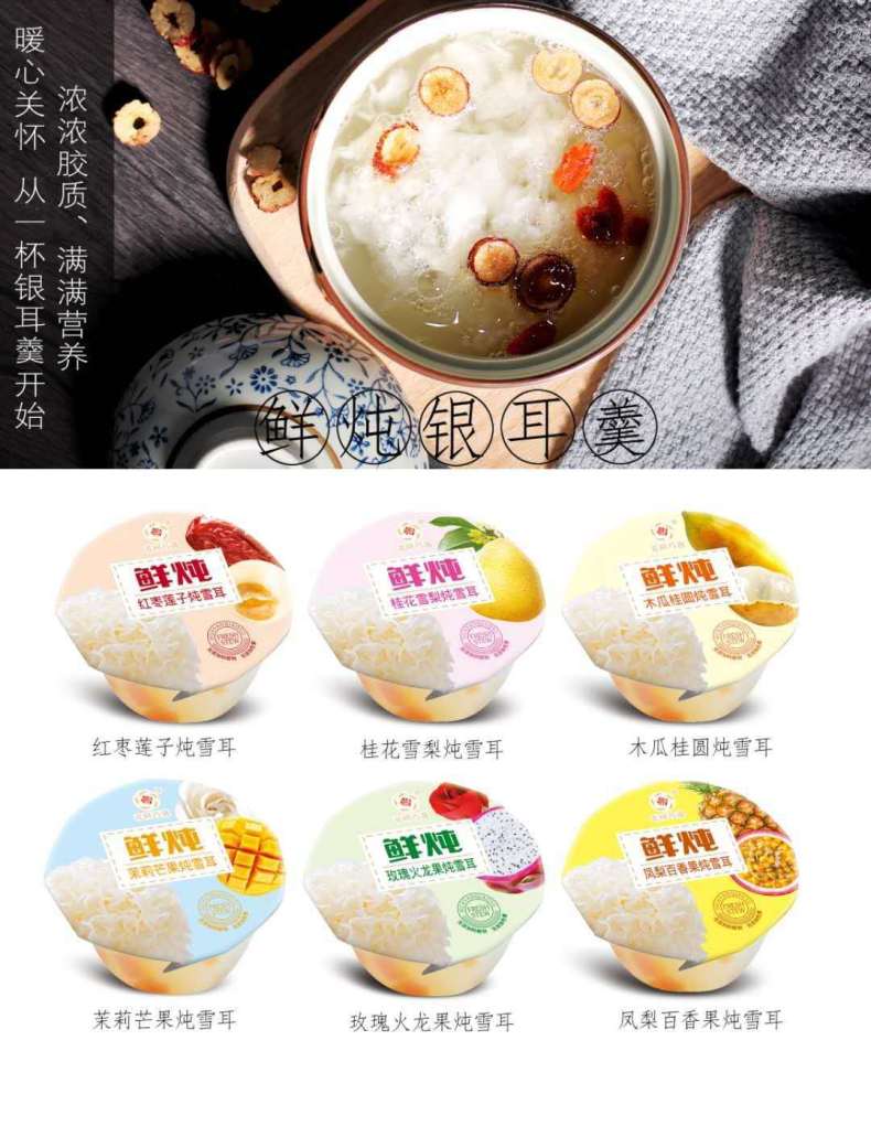 燕窝银耳羹300g/瓶,胶原蛋白银耳羹300g/瓶,阿胶银耳羹300g/瓶,人参银耳羹300g/瓶,燕窝银耳羹198g/瓶,胶原蛋白银耳羹198g/瓶,阿胶银耳羹198g/瓶,人参银耳羹198g/瓶,桂花雪梨炖银耳198g/瓶,红枣莲子炖银耳198g/瓶,凤梨百香果炖银耳198g/瓶,木瓜桂圆炖银耳198g/瓶,燕窝炖雪耳158g/碗,花胶炖雪耳158g/碗,桂花雪梨炖雪耳165g/杯,红枣莲子炖雪耳165g/杯,红枣莲子炖雪耳160g*3杯,桂花雪梨炖雪耳160g*3杯,木瓜桂圆炖雪耳160g*3杯,凤梨百香果炖雪耳160g*3杯,鲜炖雪耳系列(玫瑰火龙果/桂花雪梨/茉莉芒果/红枣莲子/凤梨百香果/木瓜桂圆)1斤/3个,鲜炖雪耳系列(玫瑰火龙果/桂花雪梨/茉莉芒果/红枣莲子/凤梨百香果/木瓜桂圆)1斤/4个,燕窝炖雪耳礼盒158g*3碗,花胶炖雪耳礼盒158g*3碗