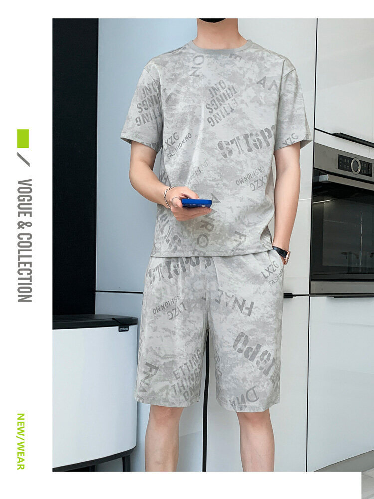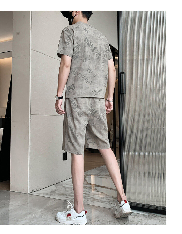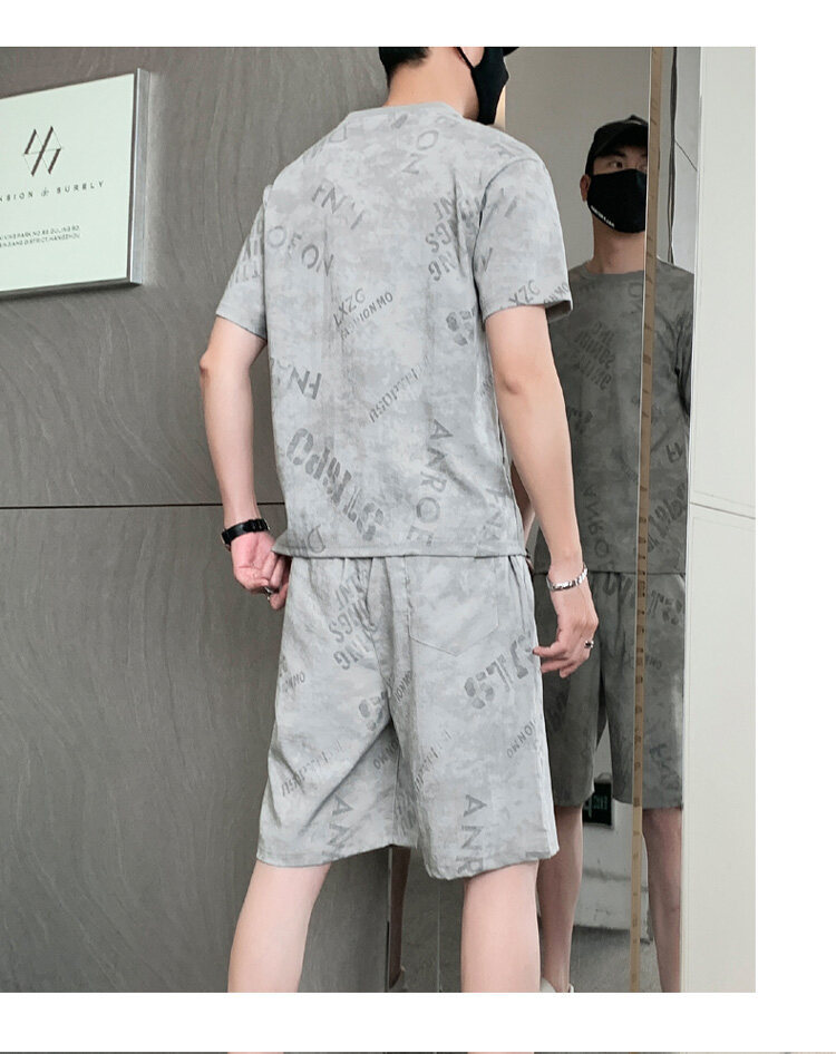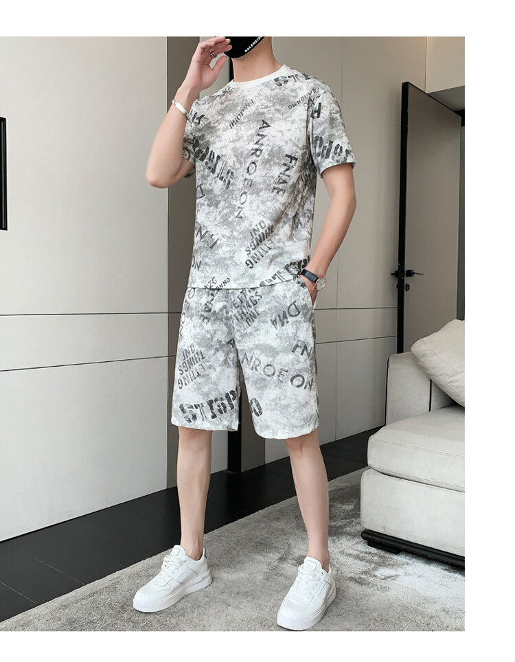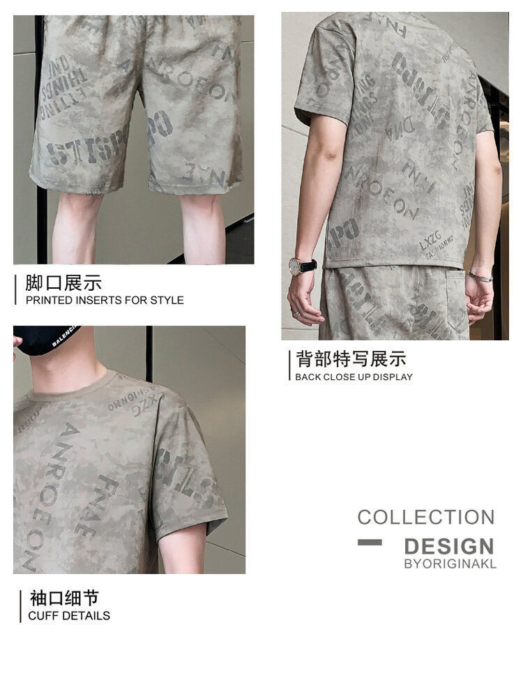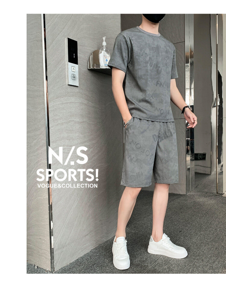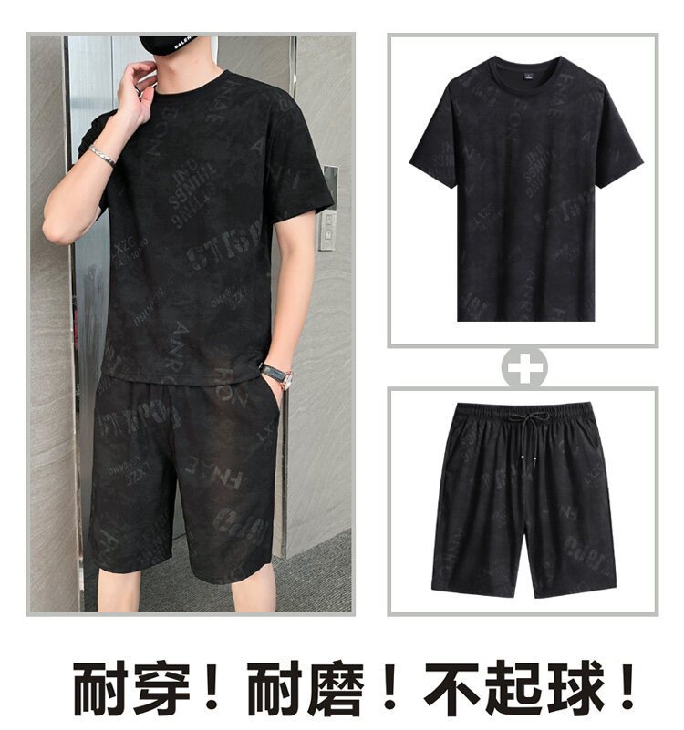2022夏季新款短袖五分裤套装男冰丝T恤运动男士印花两件套