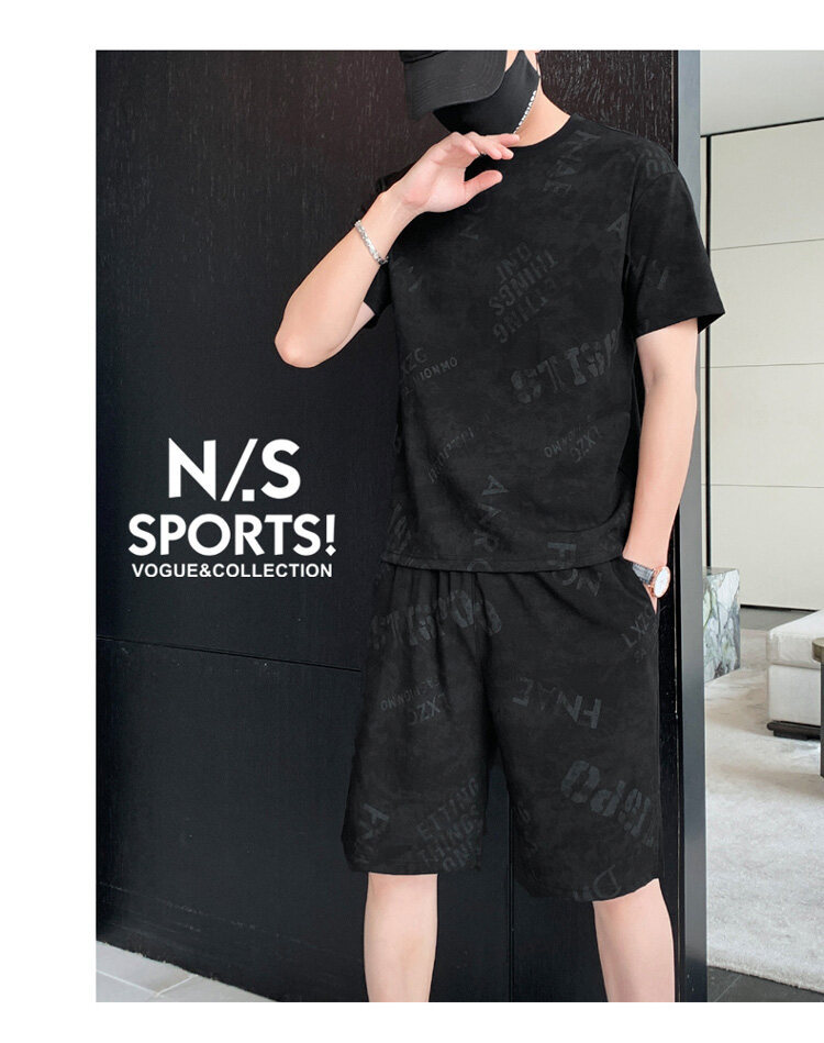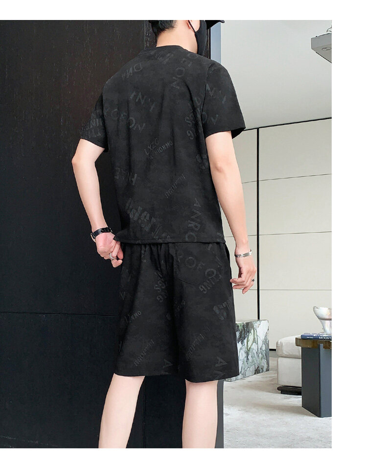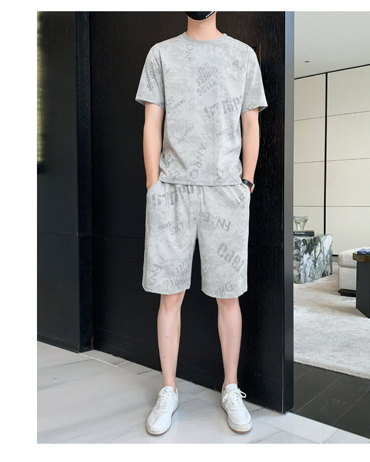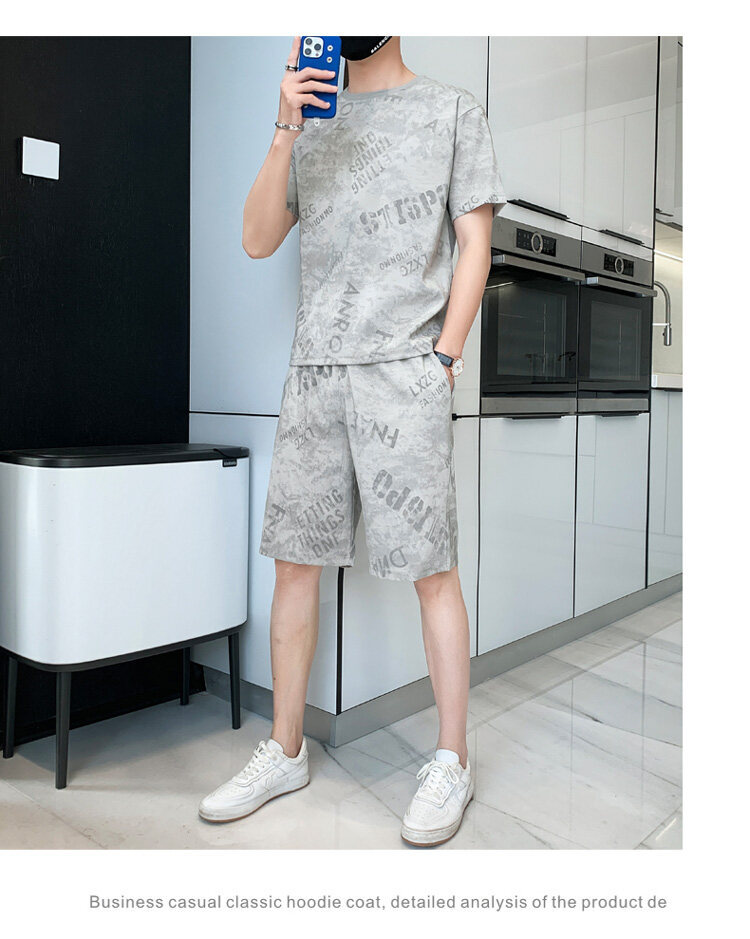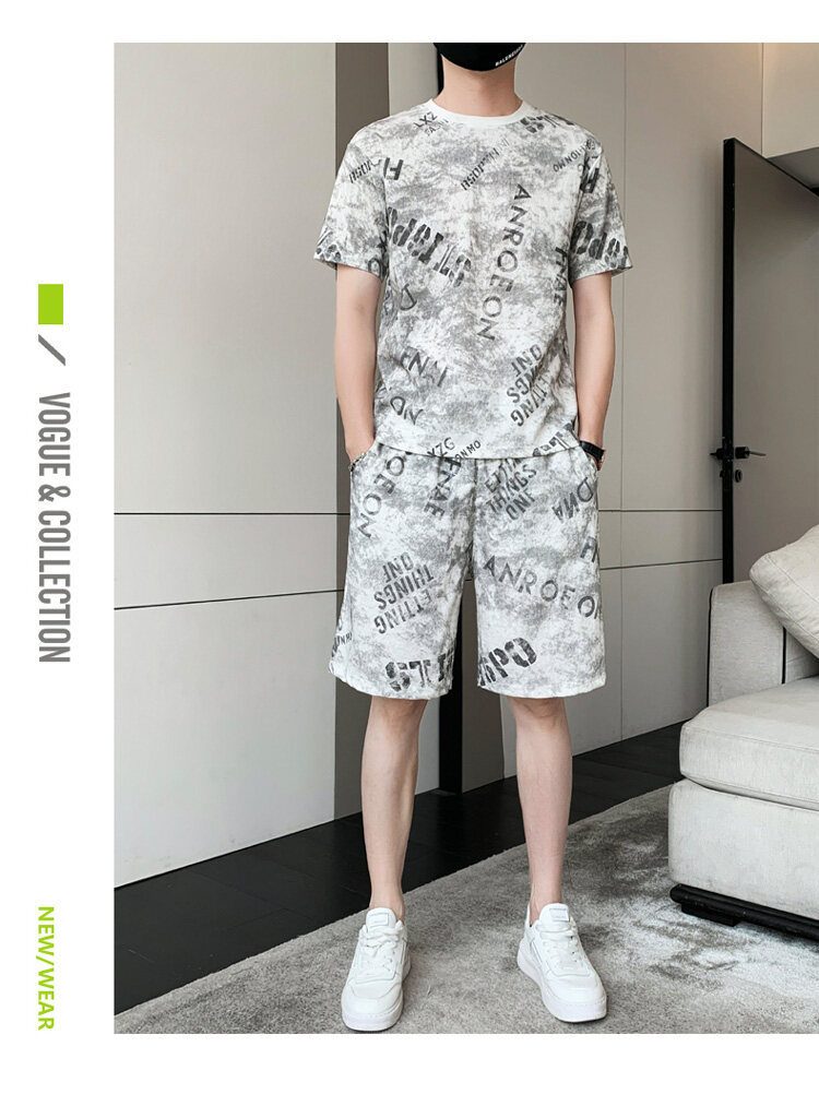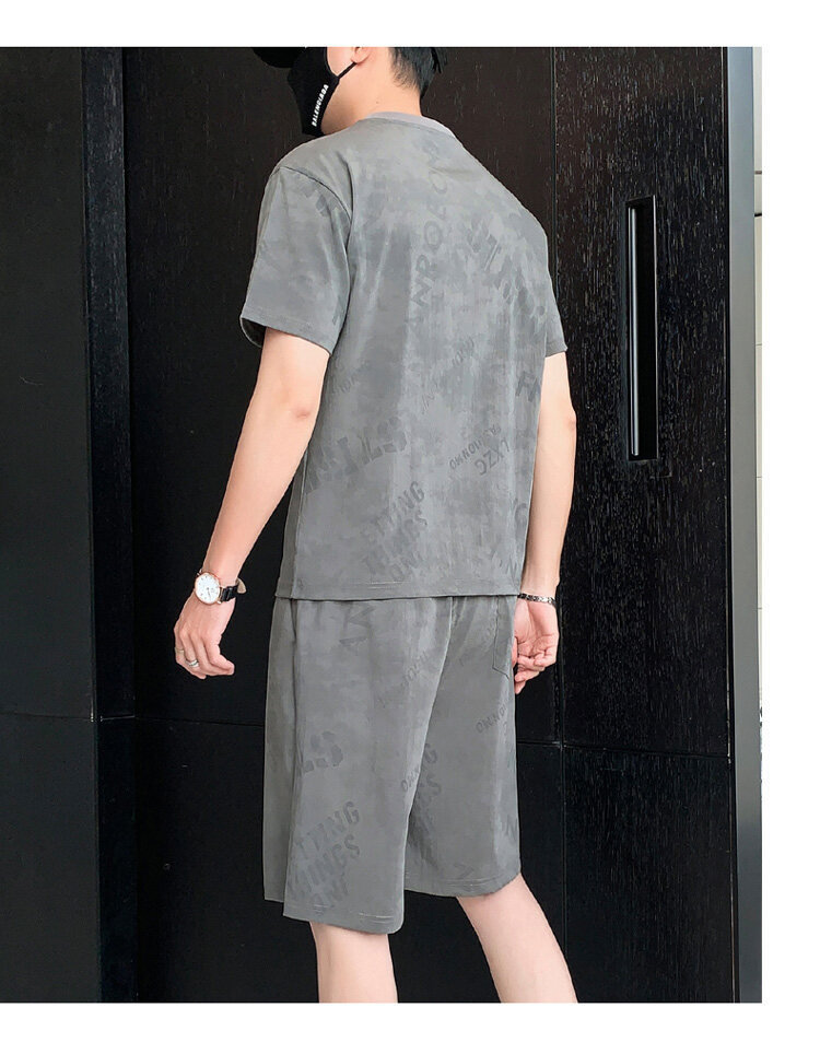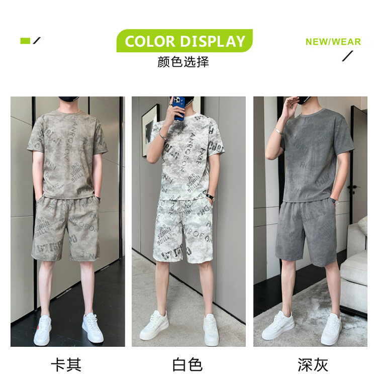 2022夏季新款短袖五分裤套装男冰丝T恤运动男士印花两件套