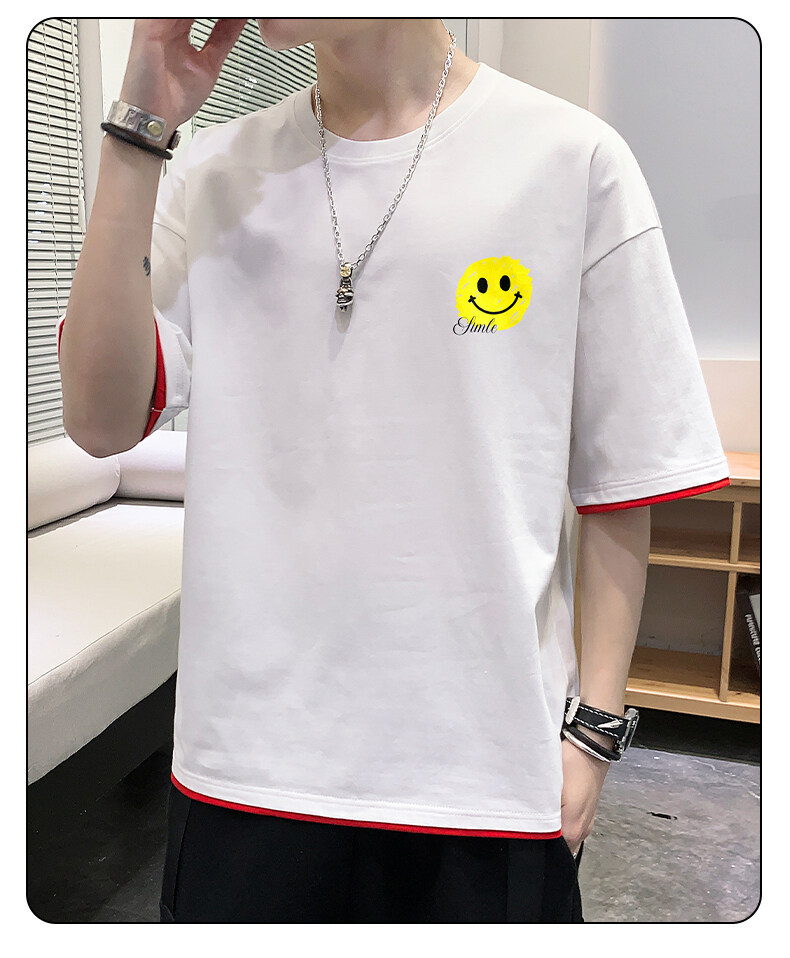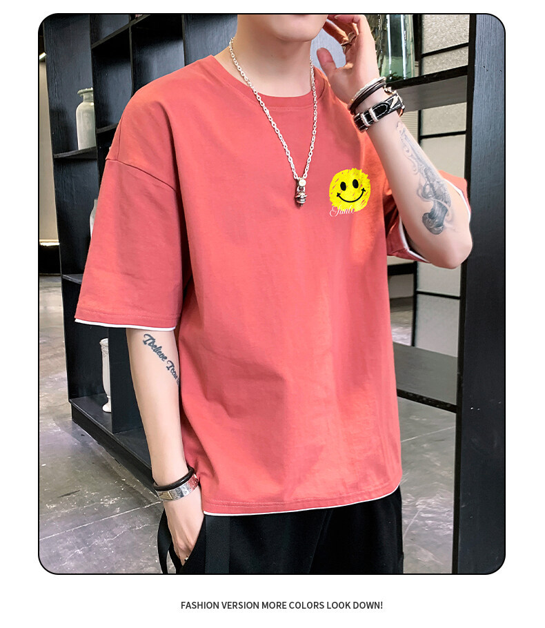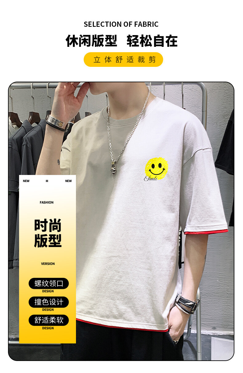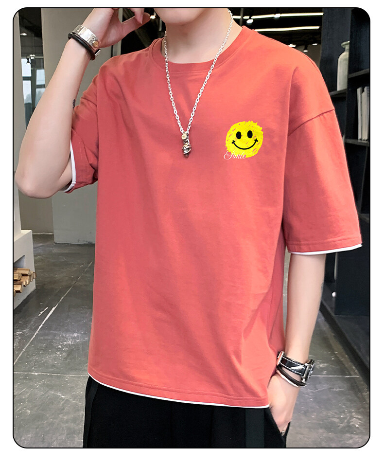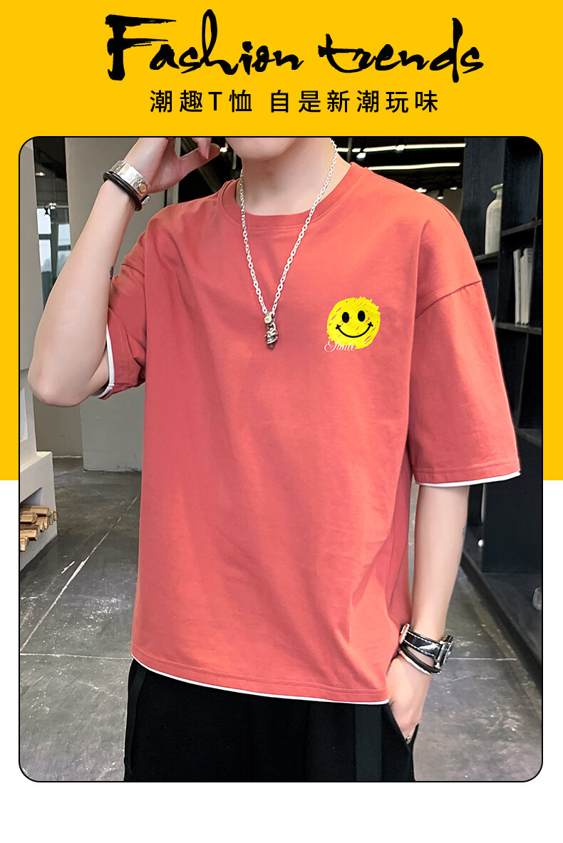 夏季纯棉短袖T恤男情侣直播爆款红色笑脸印花宽松落肩半袖打底