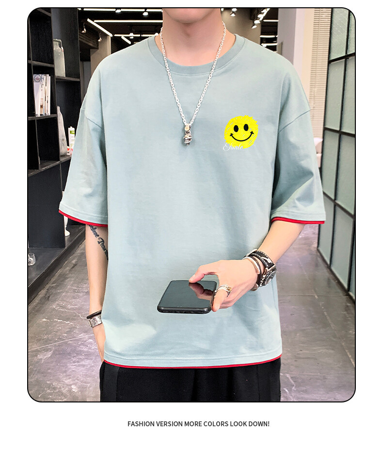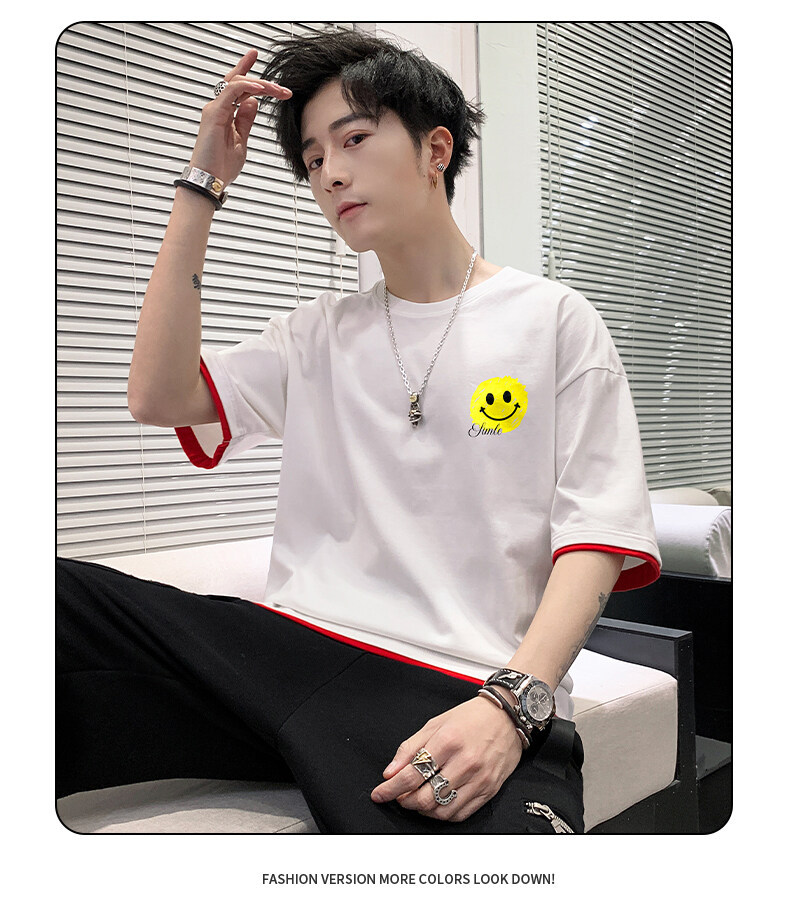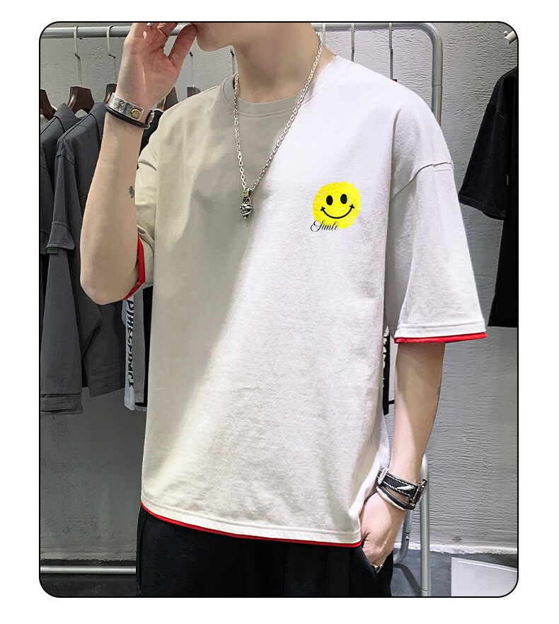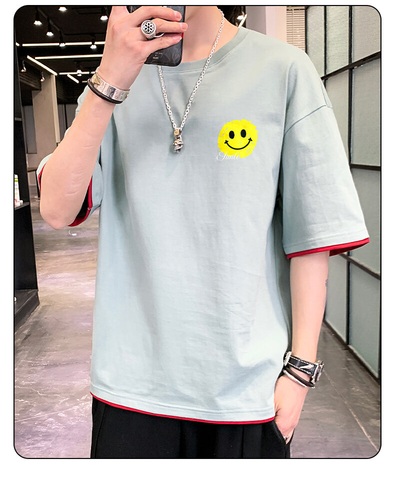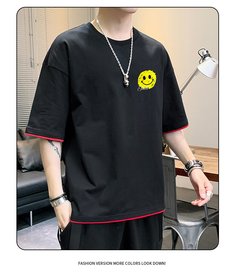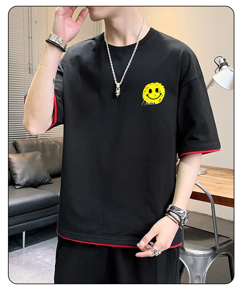 夏季纯棉短袖T恤男情侣直播爆款红色笑脸印花宽松落肩半袖打底