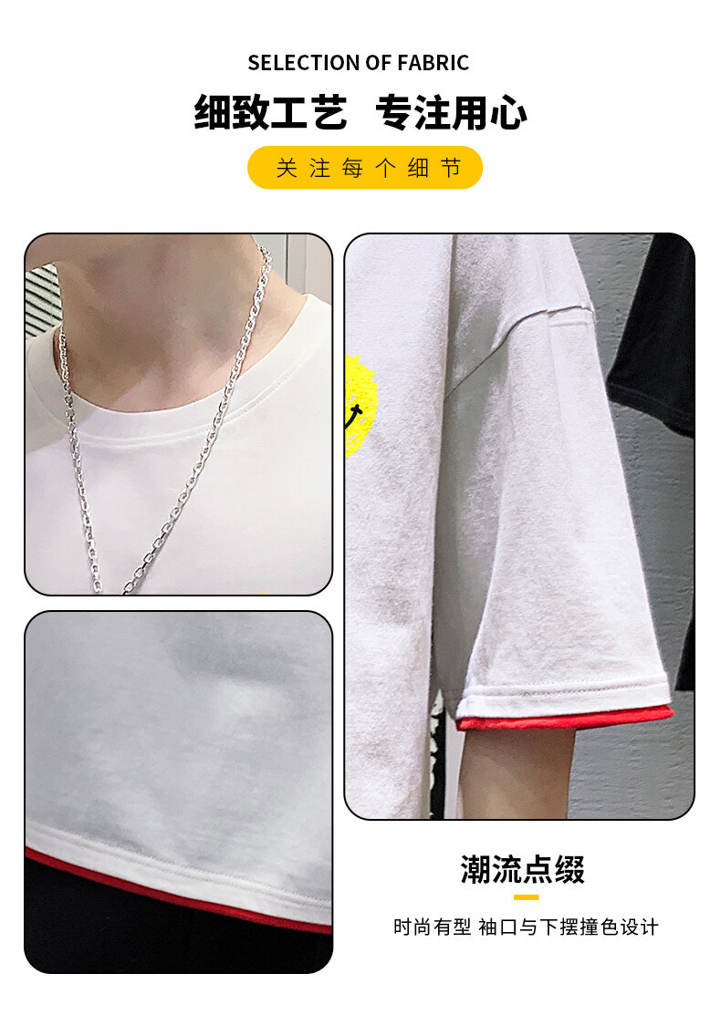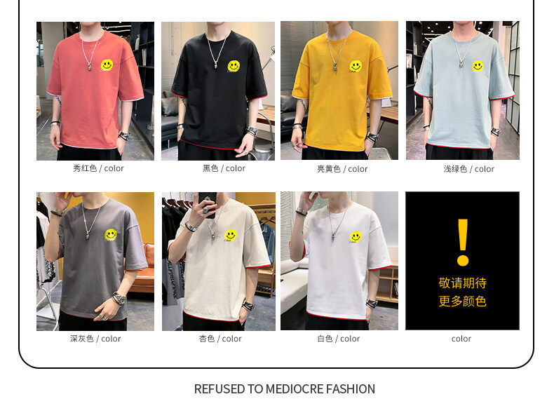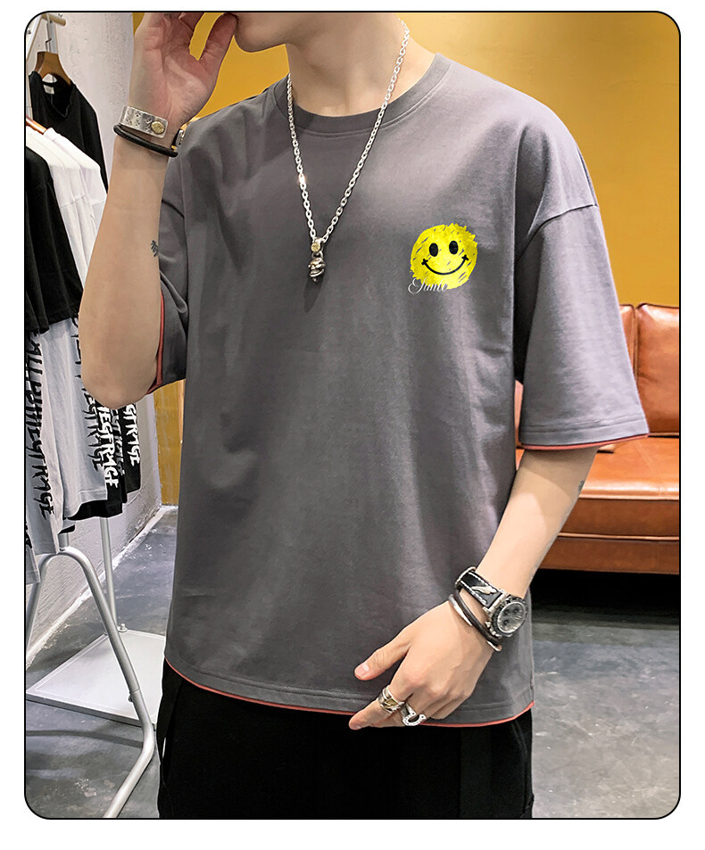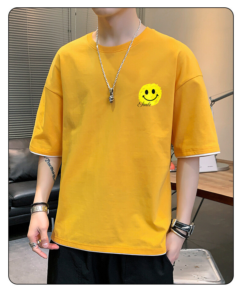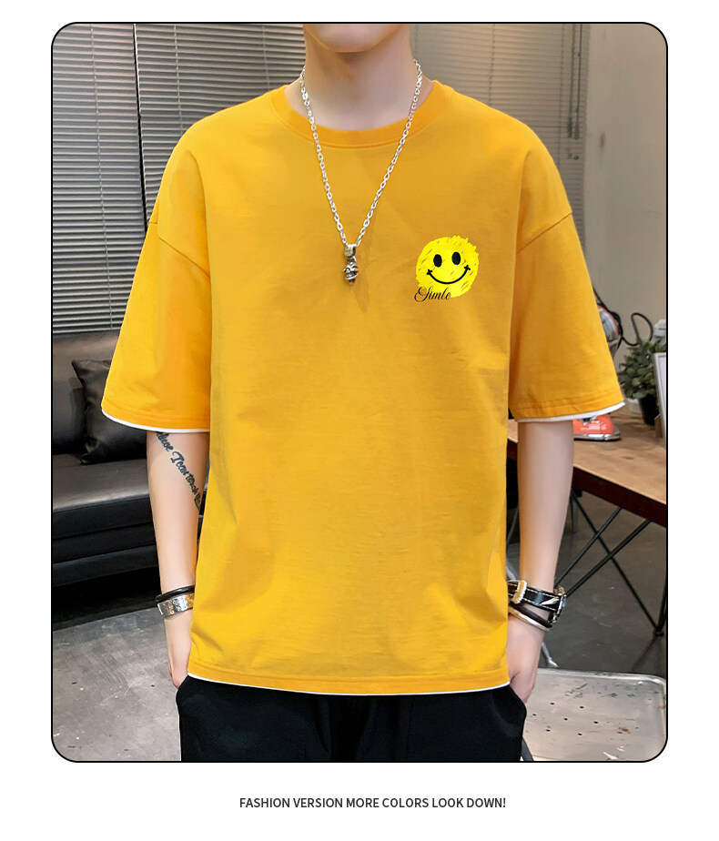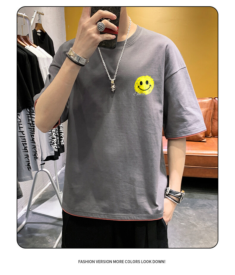 夏季纯棉短袖T恤男情侣直播爆款红色笑脸印花宽松落肩半袖打底
