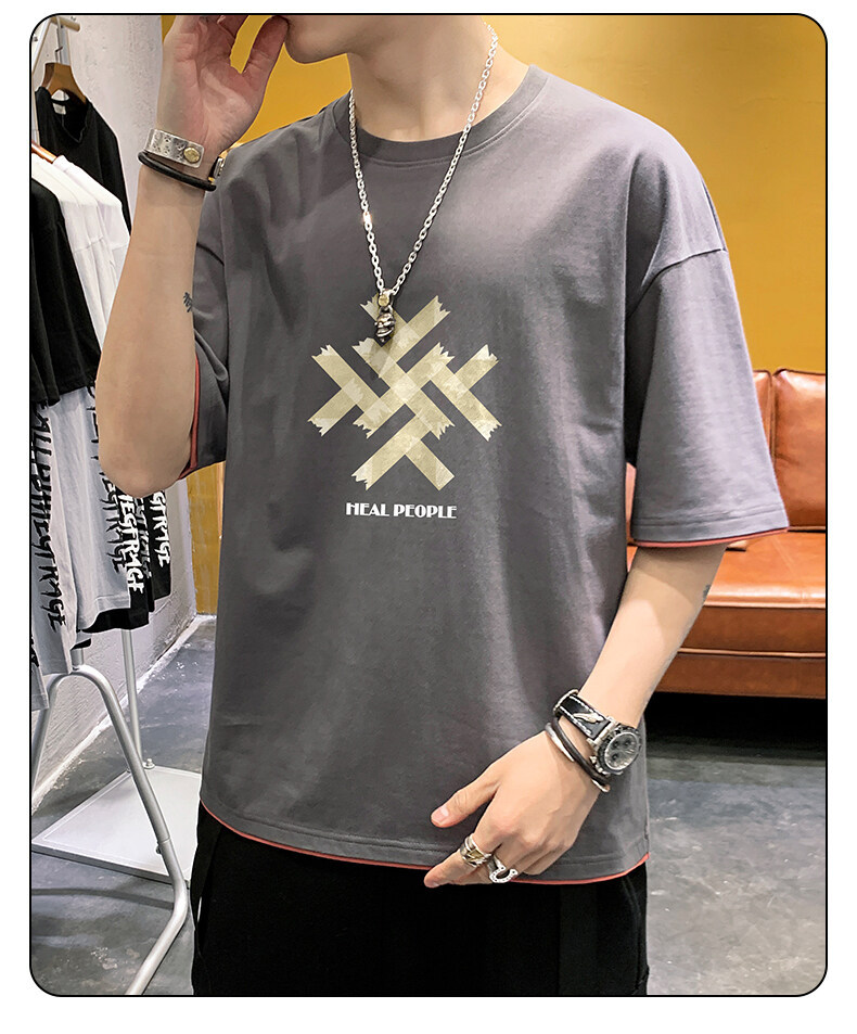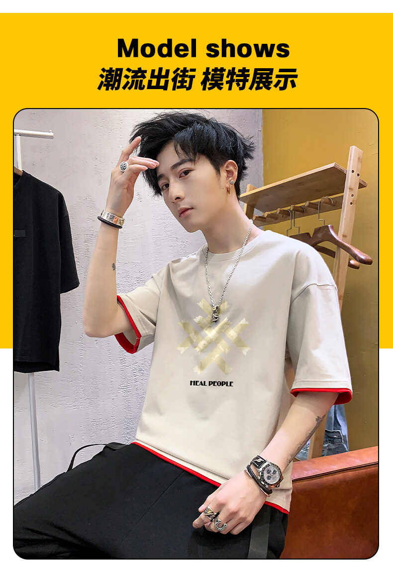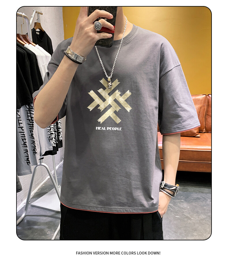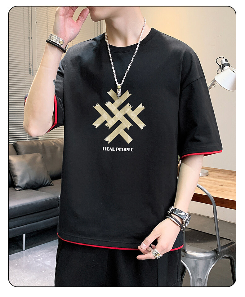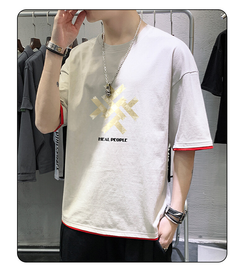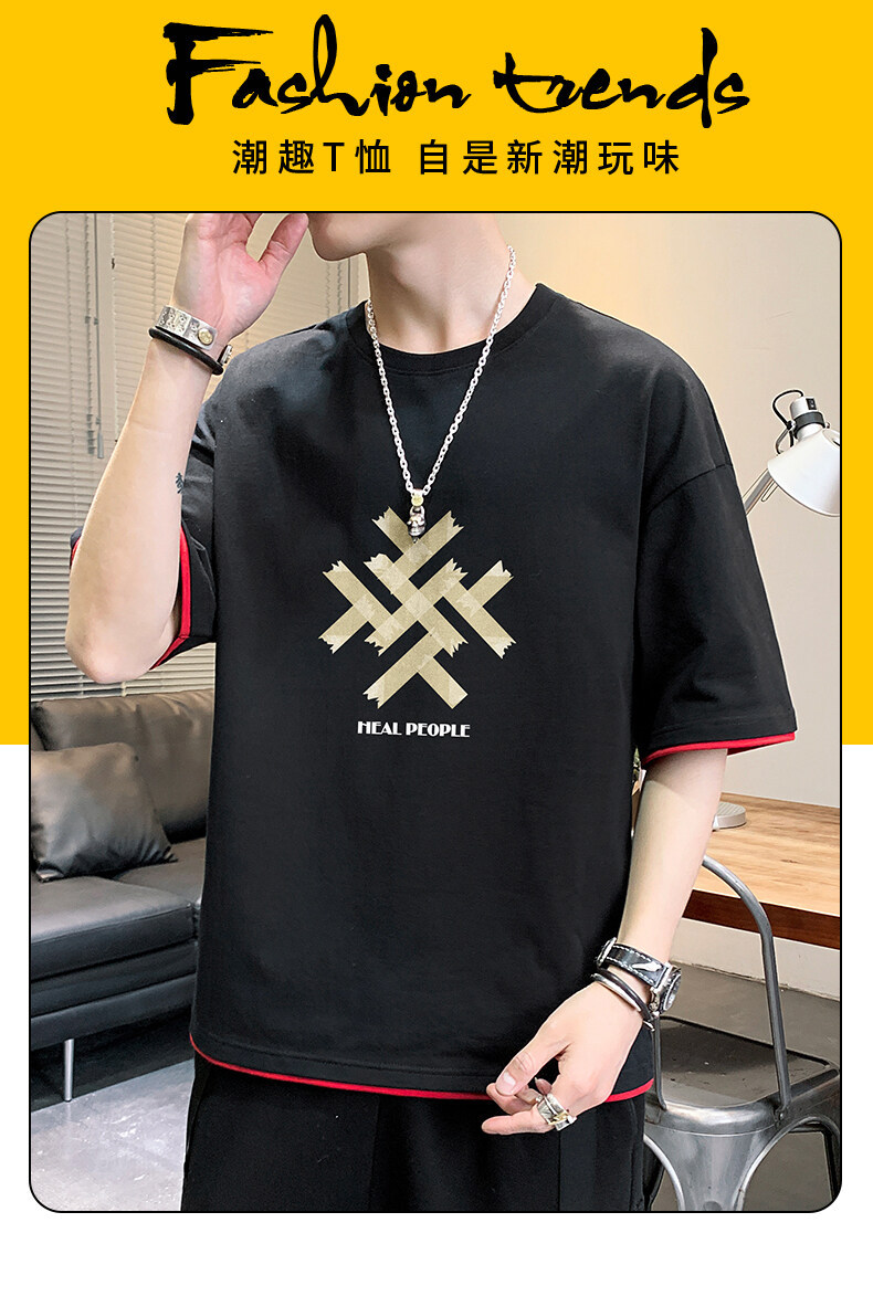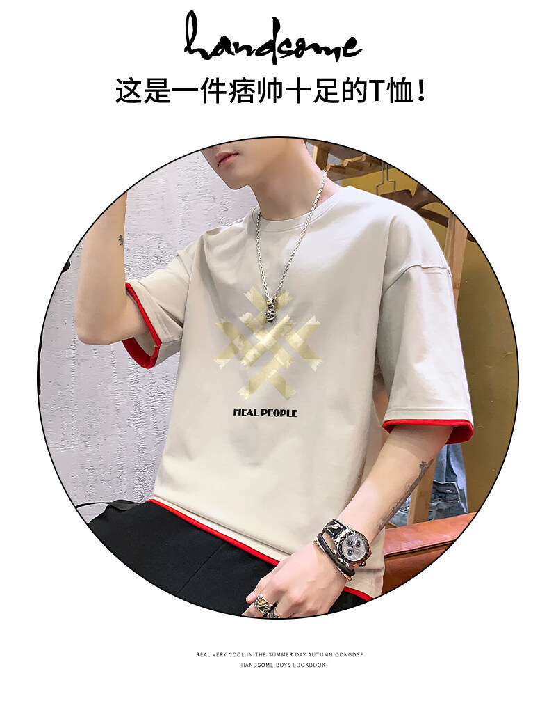 抖音快手直播夏季印花短袖T恤男宽松纯棉落肩圆领体恤休闲打底衫