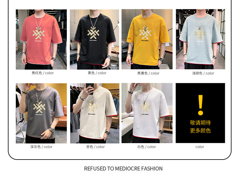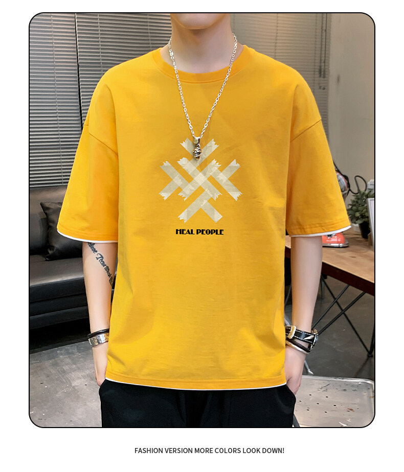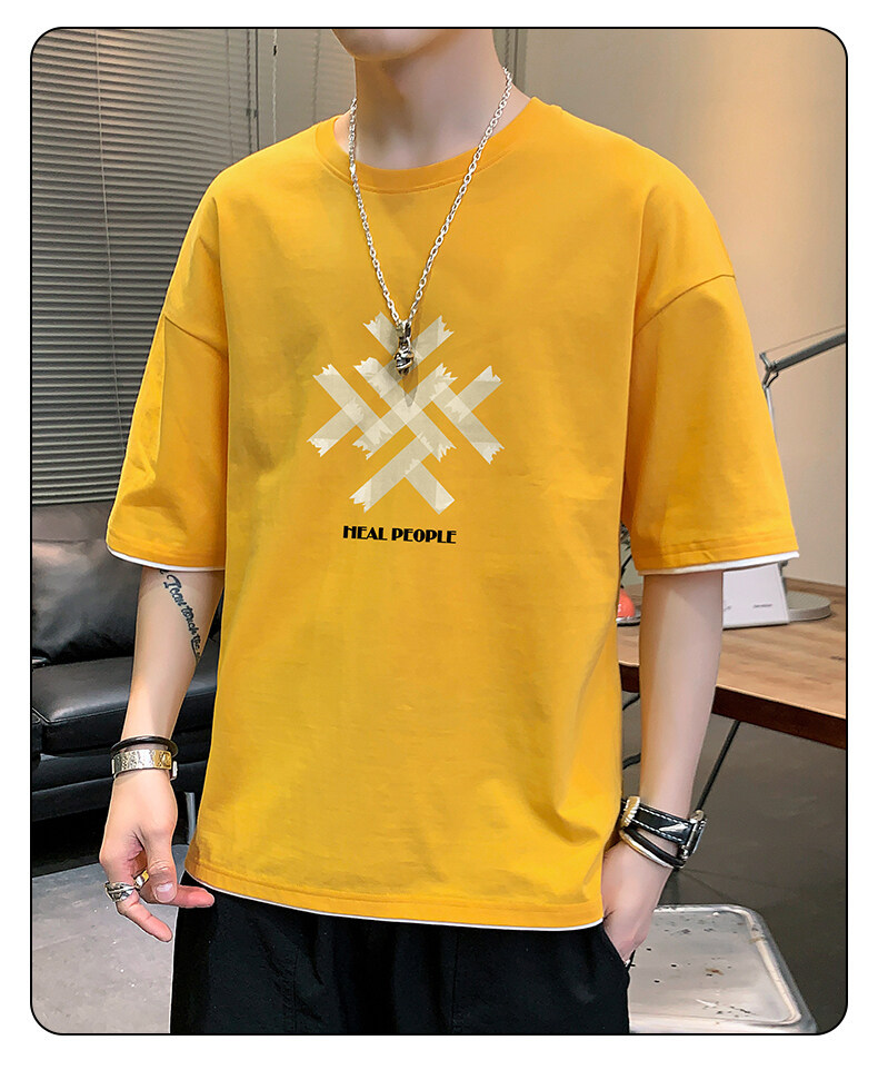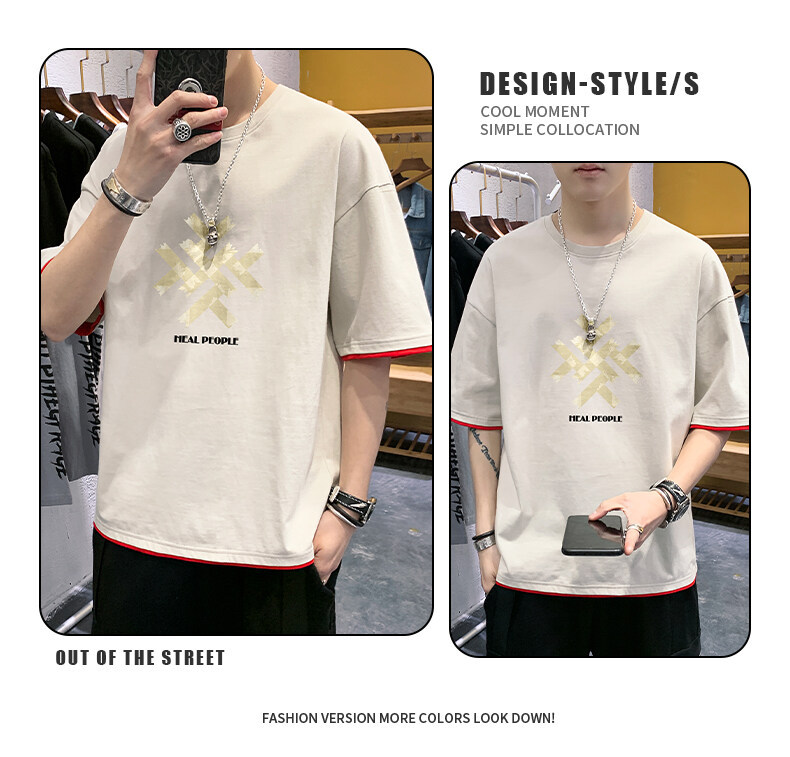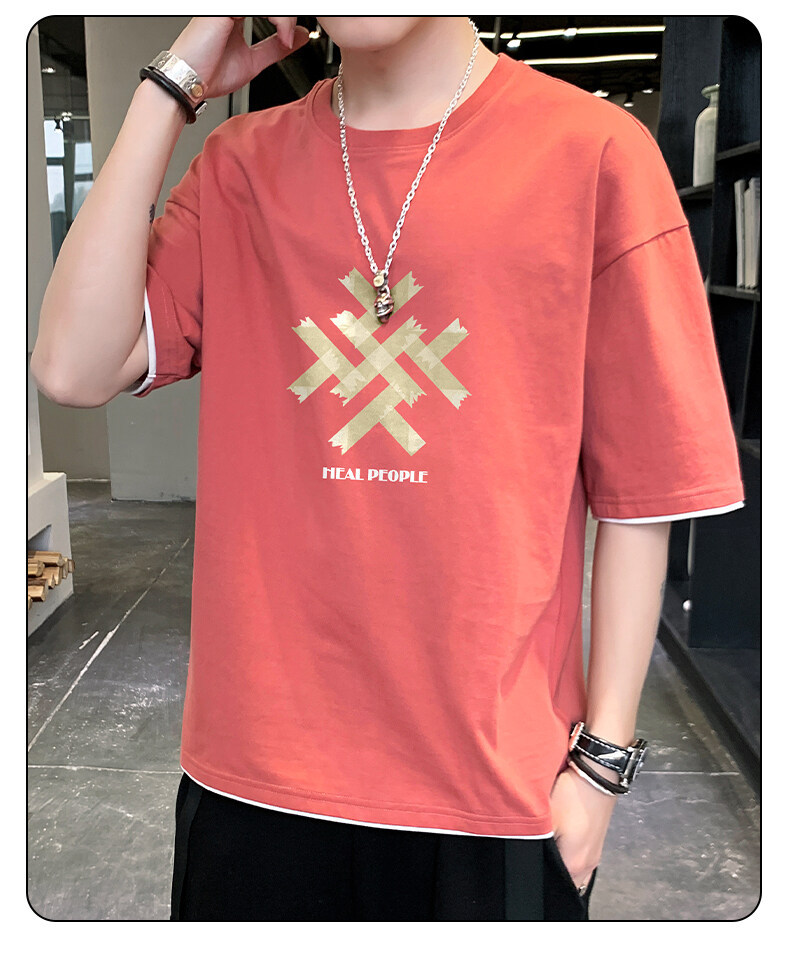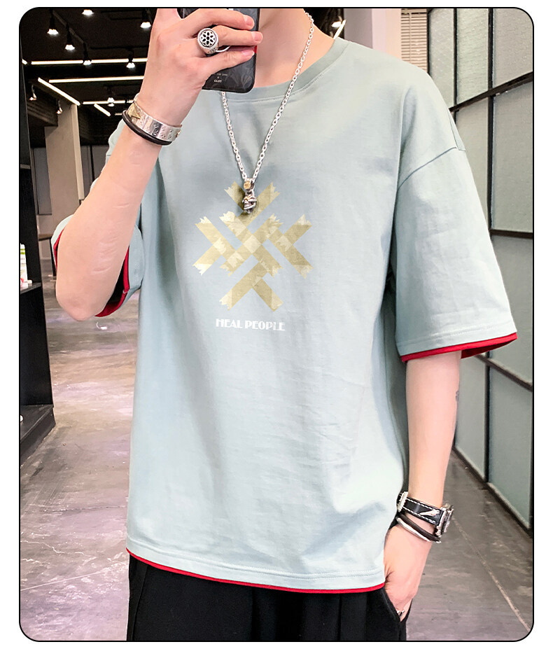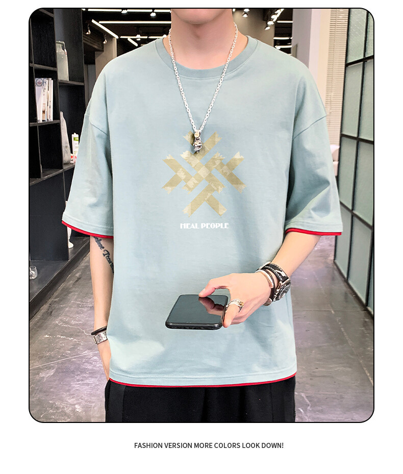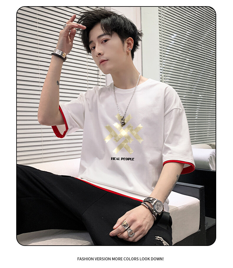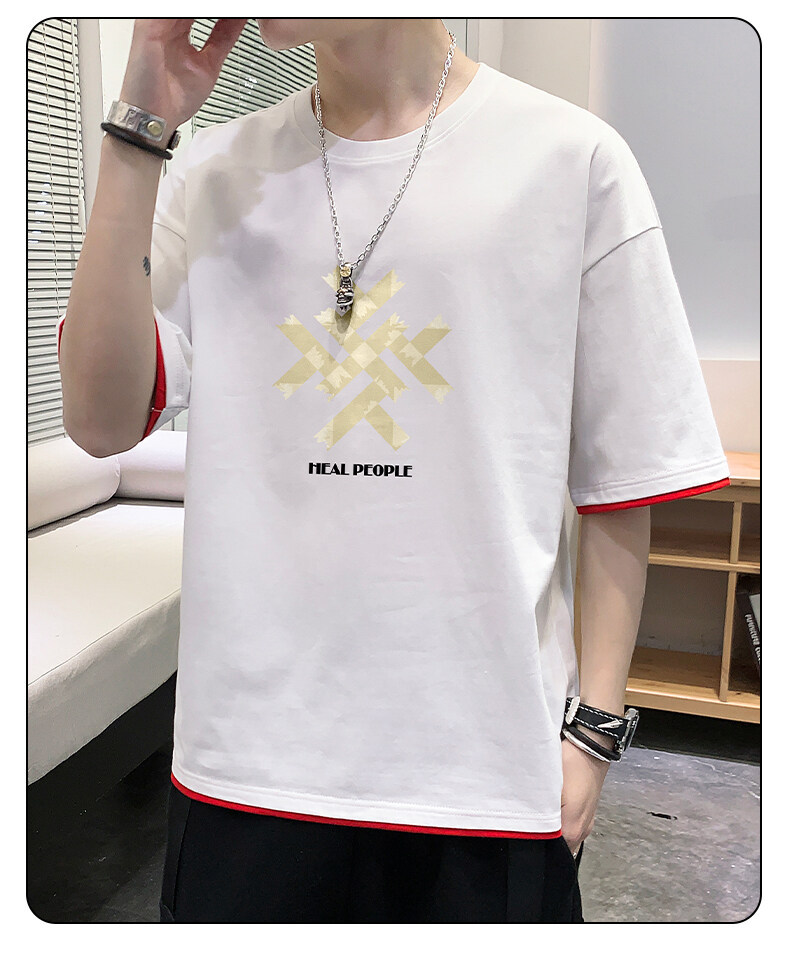 抖音快手直播夏季印花短袖T恤男宽松纯棉落肩圆领体恤休闲打底衫