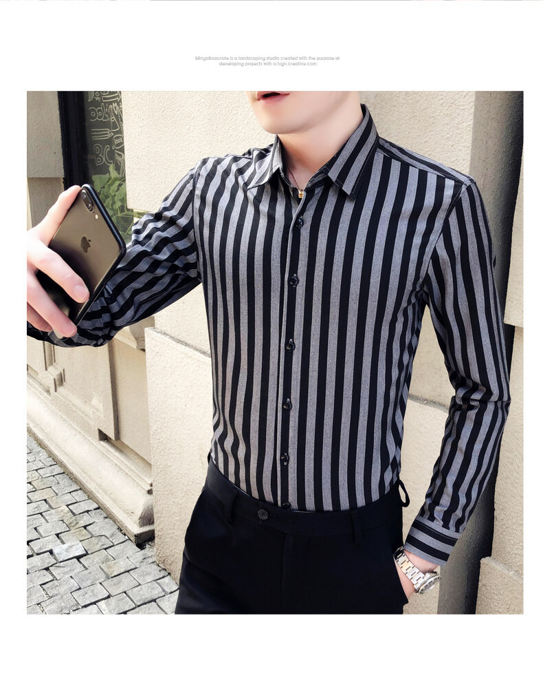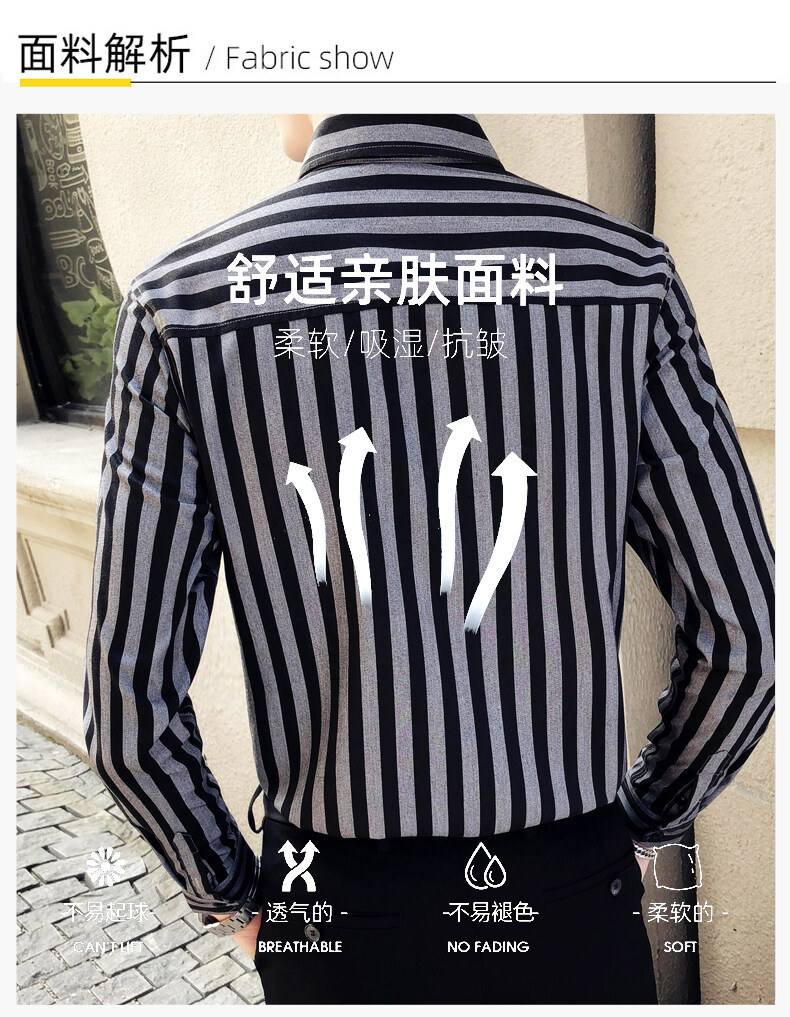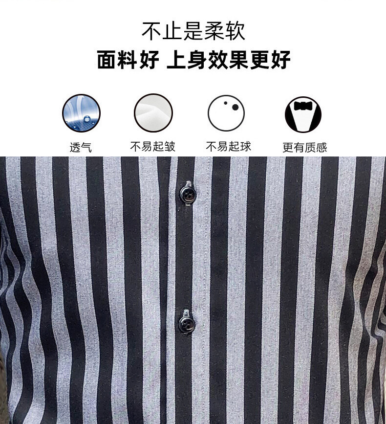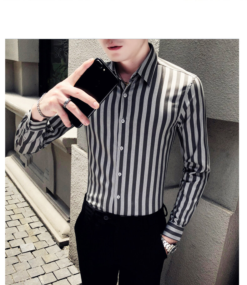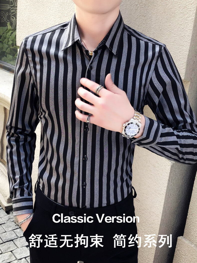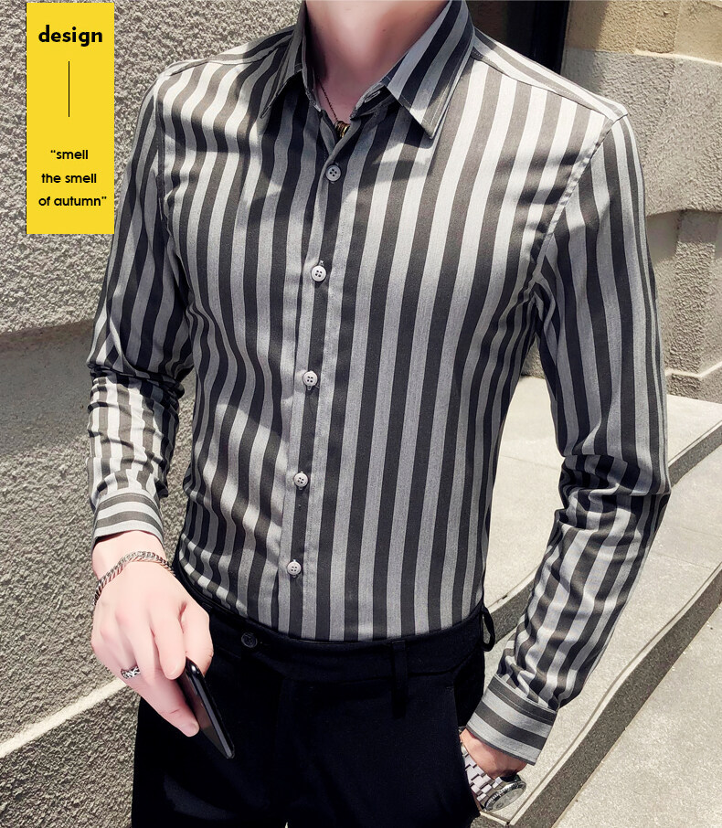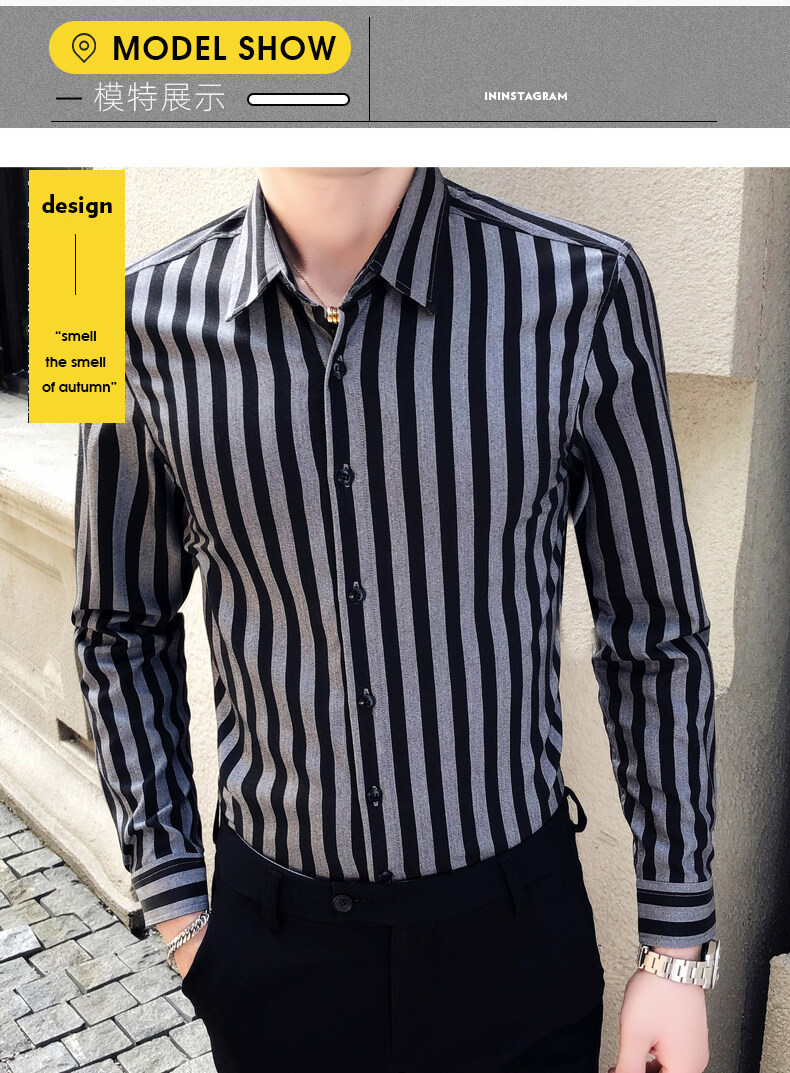 秋季男士竖条条纹长袖衬衫商务修身韩版潮流格子中青年休闲衬衣潮