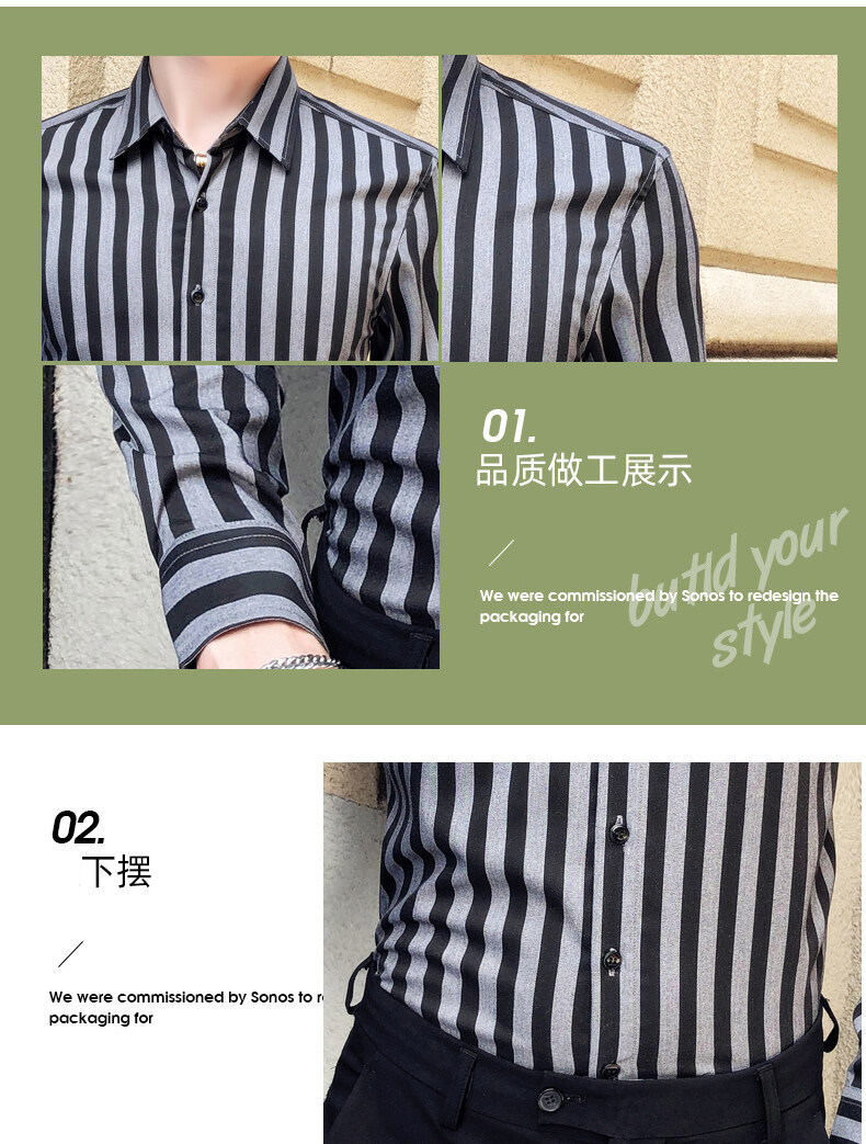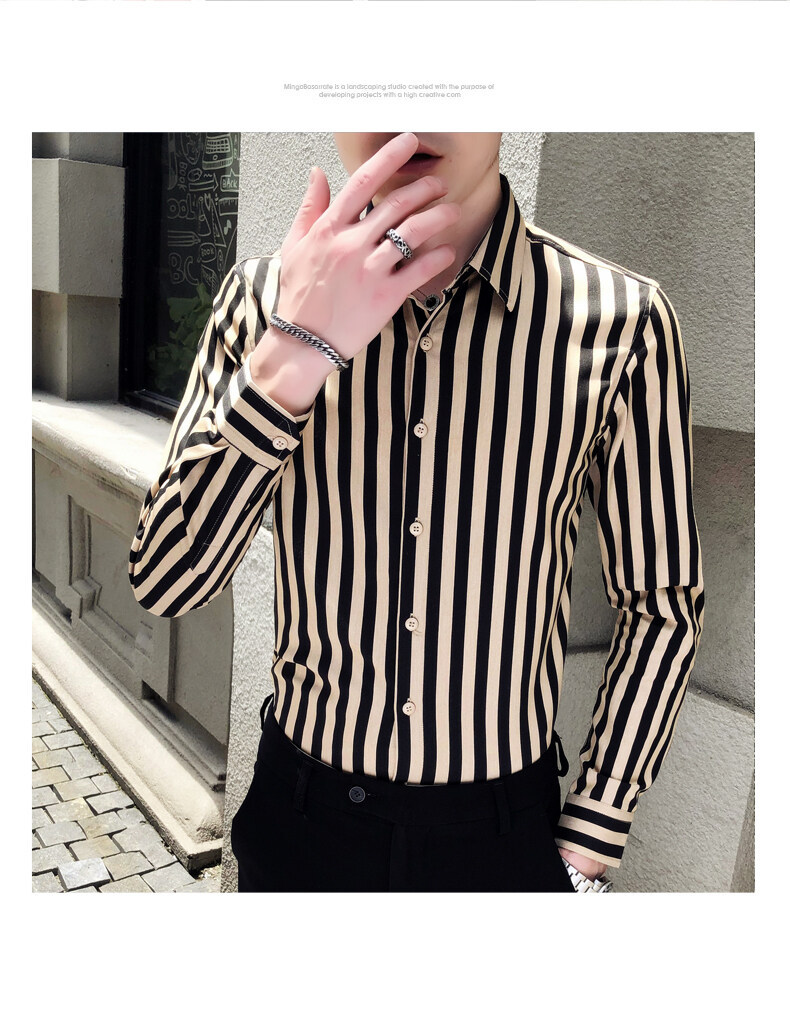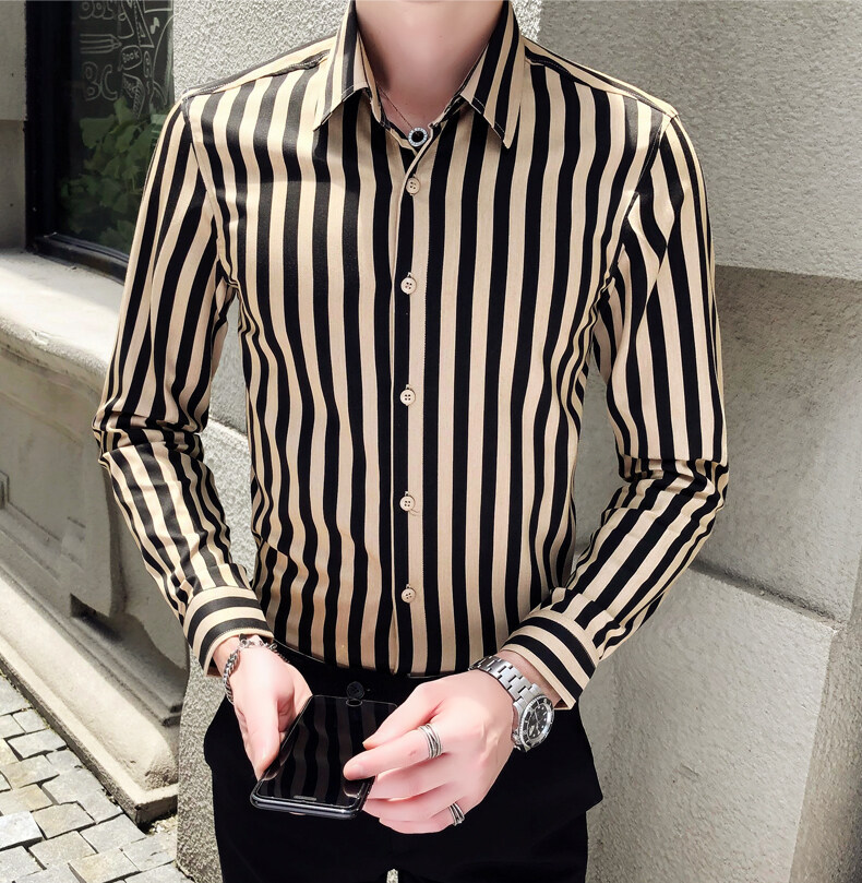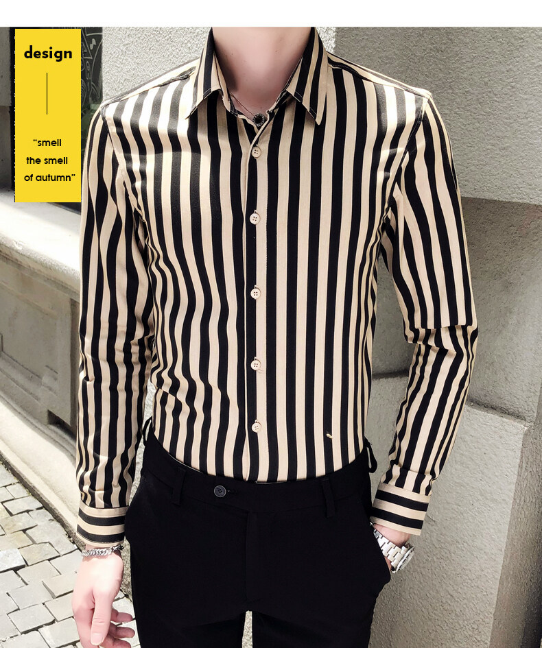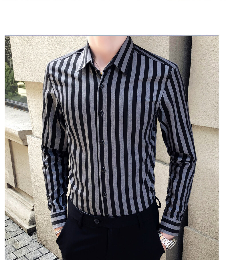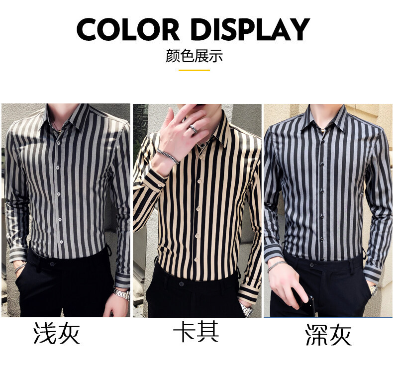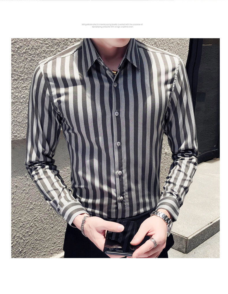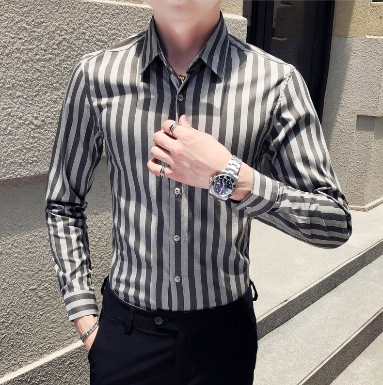 秋季男士竖条条纹长袖衬衫商务修身韩版潮流格子中青年休闲衬衣潮